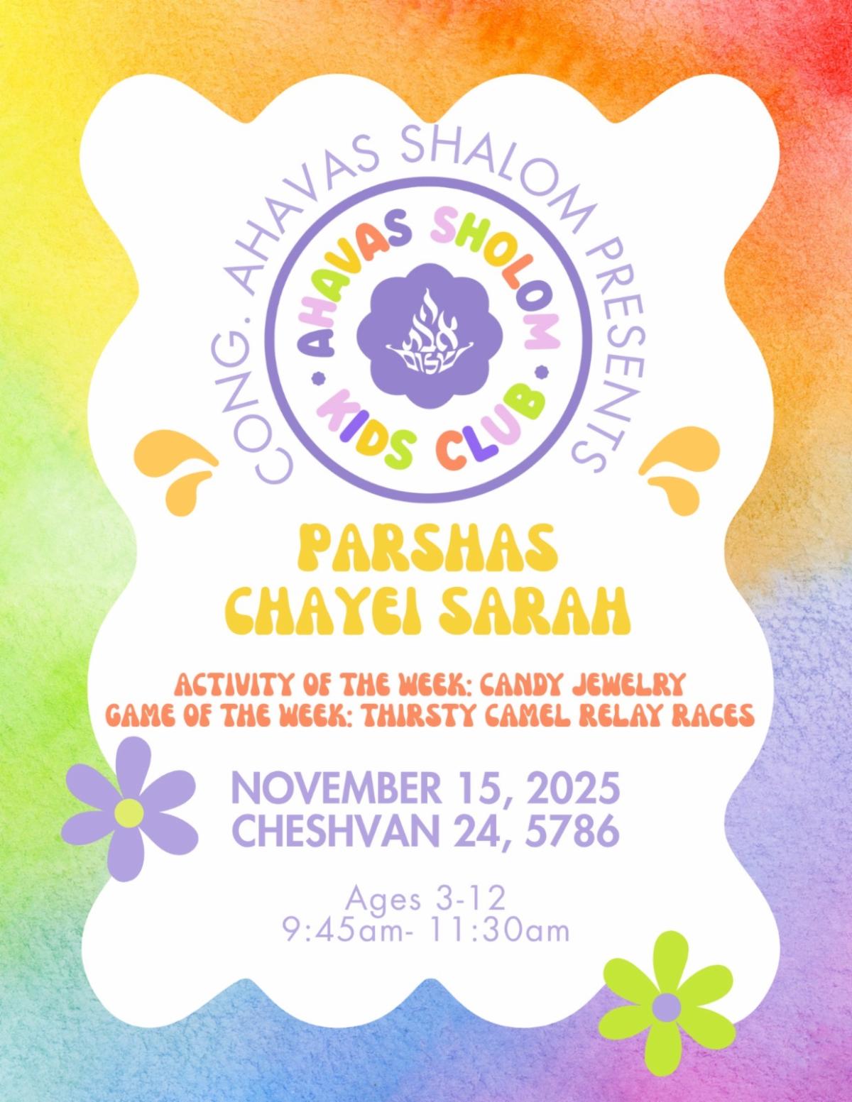 Shacharis: 9:00 AM, Kids Club: 9:45 AM