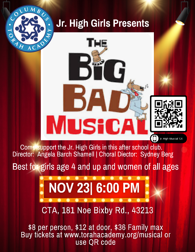 CTA Jr. High Girls will perform The Big Bad Musical on Sunday, November 23 at 6:00pm at CTA. A great and fun show for girls and women! Tickets in advance are $8 and $12 at the door. Buy online at www.torahacademy.org/musical