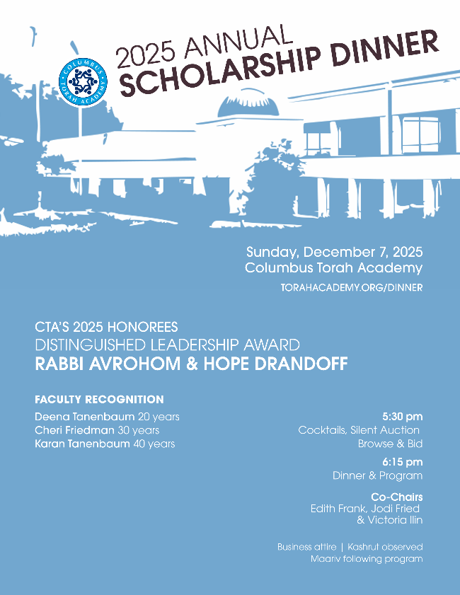 CTA's Scholarship Dinner is coming up on Sunday, December 7 with a sit down dinner and program to celebrate our incredible school and express our gratitude to Rabbi Avrohom and Hope Drandoff as well as extend faculty recognition to Deena Tanenbaum, Cheri Friedman, and Karan Tanenbaum for their decades of service. The event's success is a big boost to the Scholarship Fund which makes tuition affordable for ALL students and provides scholarships for those who need more. RSVP and purchase an ad in the Journal with all proceeds to the Scholarship Fund at www.torahacademy.org/dinner Now more than ever we need to stand in support of our school, Jewish literacy, and our children's Jewish future.