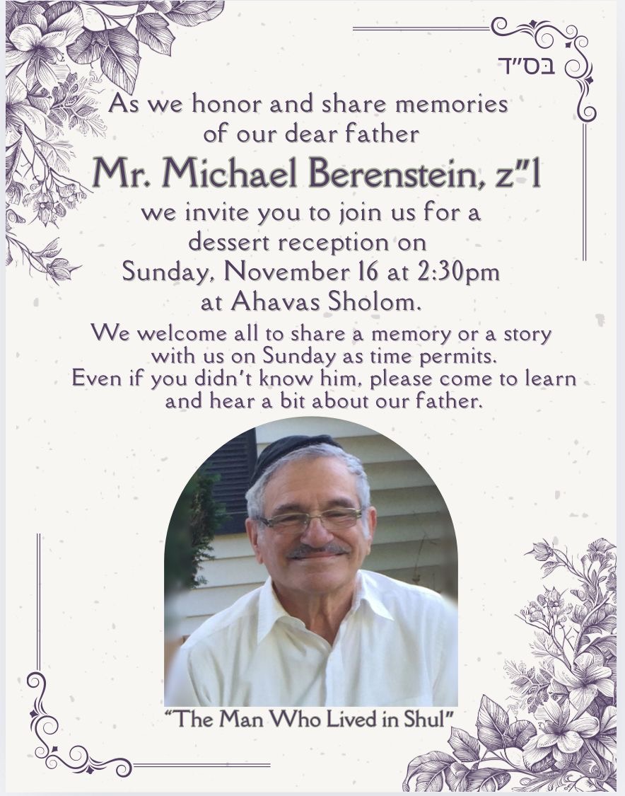 Please submit the names of cholim for the misheberach on Shabbos to ahavassholom@gmail.com by 1 PM on Thursday.
